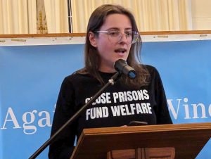 Kristin O’Connell from the Antipoverty Centre addressing an Against the Wind forum.